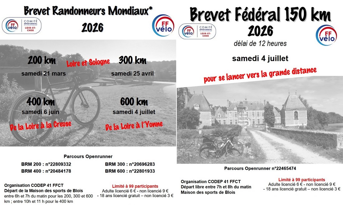 Le CODEP-41-FFCT vous propose pour 2026 cinq brevets : un brevet fédéral de 150 km, et quatre BRM. Départ de la maison...